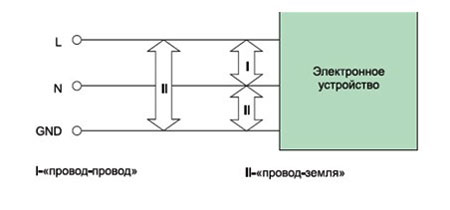 Согласно ГОСТ IEC 61000-4-5-2017 импульсные помехи могут проникать в порты электропитания кондуктивным (непосредственно по проводам) путем по следующим контурам: «провод–провод» (I), «провод–земля» (II) (рис. 1) (L-фаза, N-нейтраль, GND-земля).