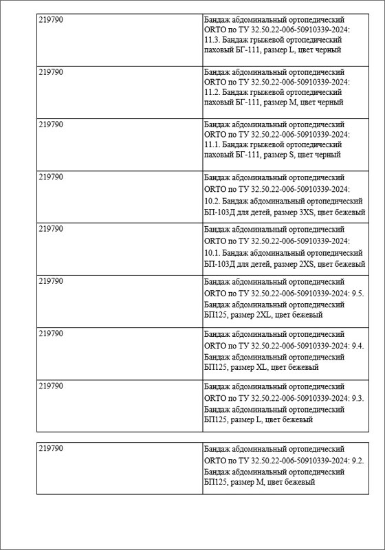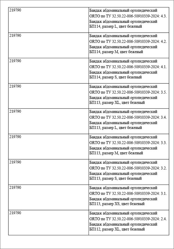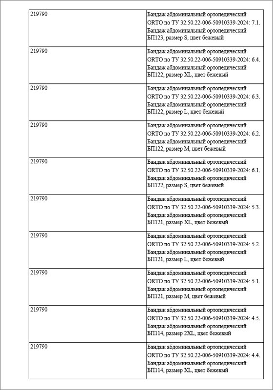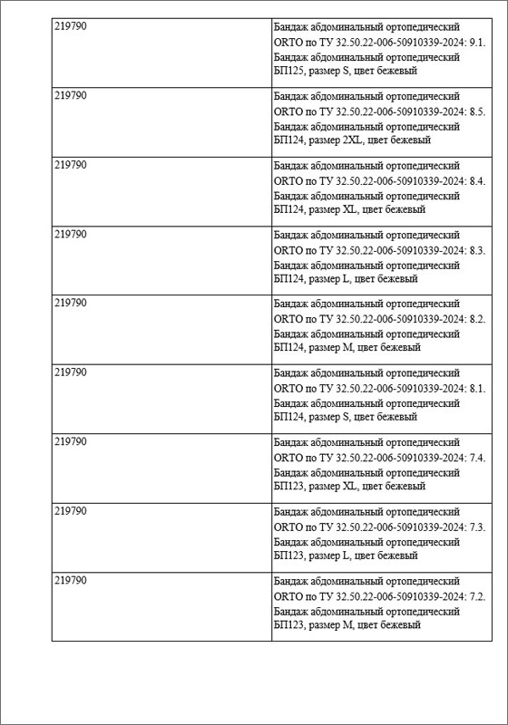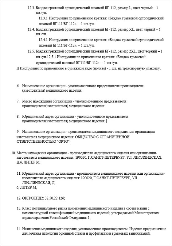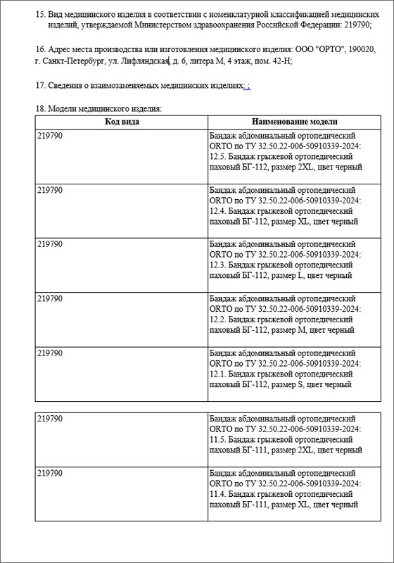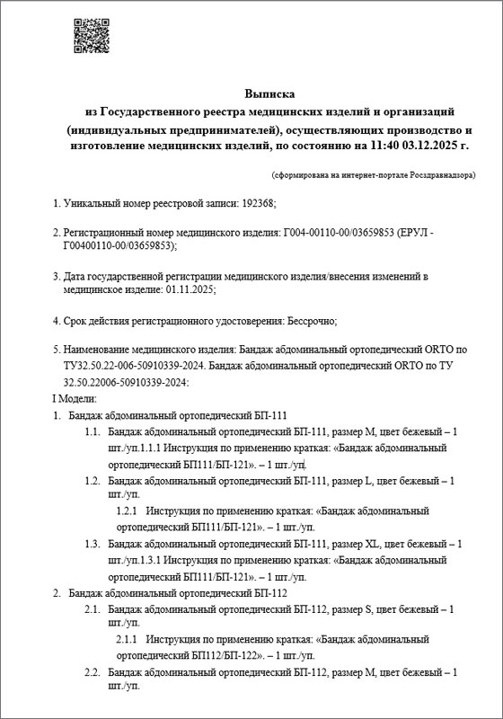 1 ноября 2025 года Федеральной службой по надзору в сфере здравоохранения (Росздравнадзор) была произведена регистрация медицинского изделия: «Бандаж абдоминальный ортопедический» по ТУ 32.50.22-006-50910339-2024, внесённого в Государственный реестр медицинских изделий под номером Г004-00110-00/03659853 (ЕРУЛ - Г004- 00110-00/03659853), производства Общества с ограниченной ответственностью «ОРТО», 190020, г. Санкт- Петербург, ул. Лифляндская, д. 6, литер М, страна-производитель Россия.