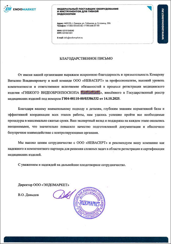 Рис. 1 Благодарственное письмо от ООО "Эндомаркет"