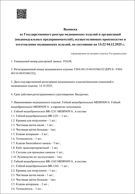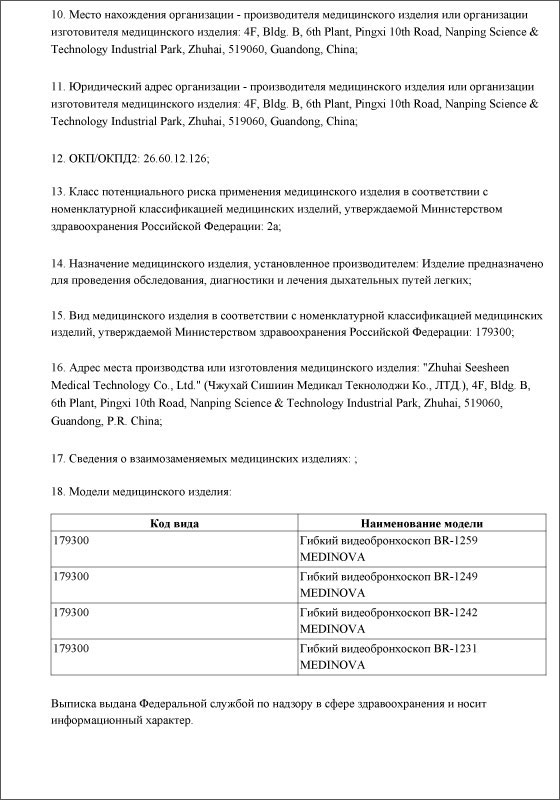 Рис. 2 Выписка из «Государственного реестра медицинских изделий и организаций (индивидуальных предпринимателей), осуществляющих производство и изготовление медицинских изделий», о регистрации медицинского изделия: «Гибкий видеобронхоскоп» производства Zhuhai Seesheen Medical Technology Co., Ltd. (Чжухай Сишиин Медикал Текнолоджи Ко., ЛТД.), Китай.