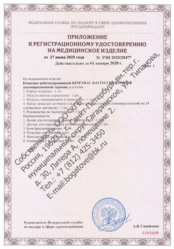 27 июня 2025 года Федеральной службой по надзору в сфере здравоохранения (Росздравнадзор) было выдано регистрационное удостоверение № РЗН 2025/25477 на медицинское изделие: «Комплекс роботизированный для декомпрессионной терапии» производства ХАНМЕД Ко., Лтд. (HANMED Co., Ltd.), республика Корея; уполномоченный представитель производителя медицинского изделия: Общество с ограниченной ответственностью «КОМПЛЕКСНАЯ ГАРАНТИРОВАННАЯ БЕЗОПАСНОСТЬ», Россия, 196233 г. Санкт-Петербург, ВН. ТЕР. Г. Муниципальный округ Гагаринское, ул. Типанова, д. 30, Литера А, помещ. 2.