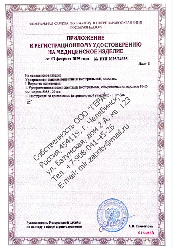 3 февраля 2025 года Федеральной службой по надзору в сфере здравоохранения (Росздравнадзор) было выдано регистрационное удостоверение № РЗН 2025/24625 на медицинское изделие: «Уроприемник однокомпонентный» производства Жейианг Лонгтерм Медикал Технолоджи Ко., Лтд, КНР, уполномоченный представитель производителя медицинского изделия: Общество с ограниченной ответственностью «ГЕРА» (ООО»ГЕРА»), Россия, 454119, Челябинская область, г.о. Челябинский район, г. Челябинск, ул. Батумская, д. 2А, кв. 123, страна-производитель Россия.