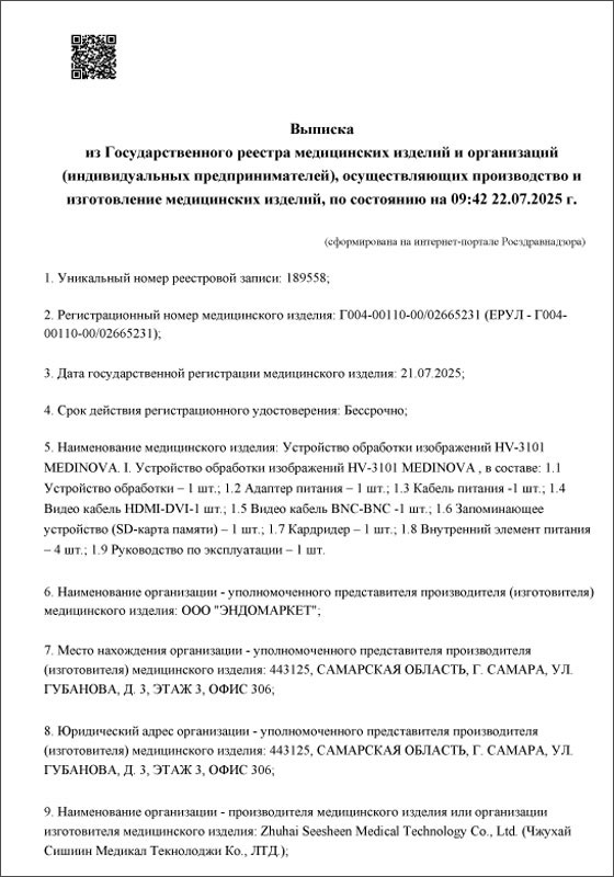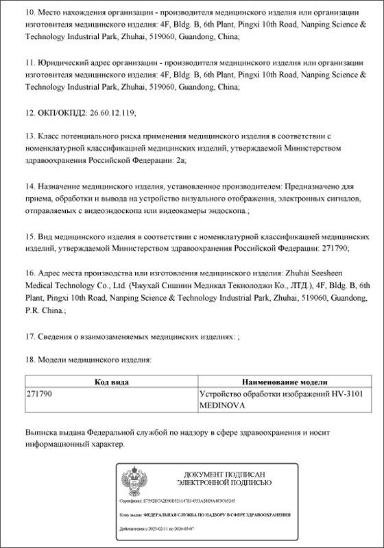 21 июля 2025 года Федеральной службой по надзору в сфере здравоохранения (Росздравнадзор) была произведена запись за № 189558 в «Государственном реестре медицинских изделий и организаций (индивидуальных предпринимателей), осуществляющих производство и изготовление медицинских изделий», о регистрации медицинского изделия: «Устройство обработки изображений» производства Zhuhai Seesheen Medical Technology Co., Ltd. (Чжухай Сишиин Медикал Текнолоджи Ко., ЛТД.), Китай, регистрационный номер медицинского изделия: Г004-00110-00/02665231; уполномоченный представитель производителя медицинского изделия: Общество с ограниченной ответственностью «ЭНДОМАРКЕТ», 443125, Самарская область, г. Самара, ул. Губанова, д. 3, этаж 3, офис 306.