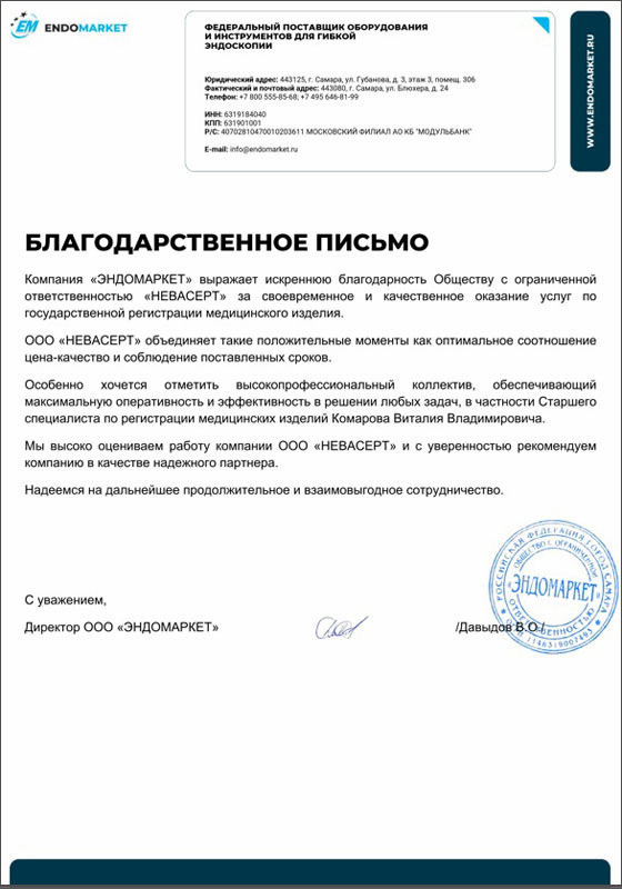Рис.1 Благодарственное письмо от ООО "ЭНДОМАРКЕТ"