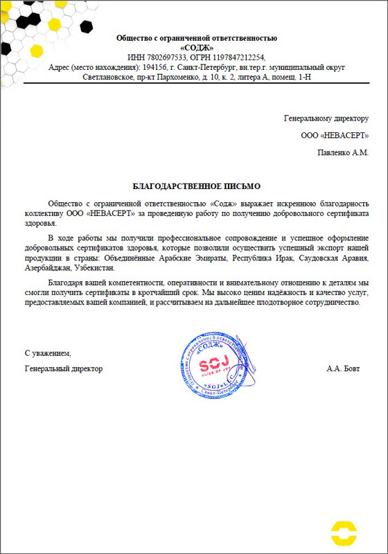 В адрес ООО «Невасерт» поступил запрос от Общества с ограниченной ответственностью «Содж» на оформление сертификата здоровья на производимую продукцию, которую предполагалось экспортировать в страны: Объединённые Арабские Эмираты, Республика Ирак, Саудовская Аравия, Азербайджан, Узбекистан.
