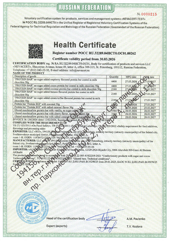 Рис. 2 Сертификат здоровья на протеиновые батончики производства ООО "СОДЖ", Россия